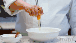 Add large amount of oil in the wok. Pour Egg mixture slowly to the wok, making a string.