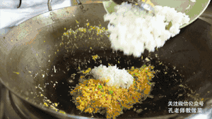 16. 调入盐,倒入冷却好的米饭,边打散边翻炒。