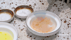 7. 虾仁中调入盐,蛋清抓匀,然后加入少许干淀粉抓匀。